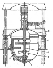 1-корпус, 2 - крышка, 3,4,5 - мешалки, 6 - паровая рубашка.