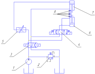 Гидропривод работает следующим образом. При нагнетании давления от насоса 1 масло поступает через гидрораспределитель 3 в бесштоковую полость гидроцилиндра 7. При достижении нижнего положения кулачок переключает конечный выключатель 8, перемещая его в нижнее положение, после чего происходит слив масла из цилиндра 7. При достижении верхнего положения кулачок переключает конечный выключатель 8, перемещая его в верхнее положение, тем самым переключая распределитель 4. Теперь масло нагнетается в гидроцилиндр 6. При достижении верхнего положения кулачок переключает конечный выключатель 8, перемещая его в верхнее положение, тем самым переключая распределитель 4. Начинается слив масла из цилиндра 6. При достижении нижнего положения кулачок переключает конечный выключатель 8, перемещая его в нижнее положение, при этом переключается распределитель 3 и опять начинается нагнетание масла в гидроцилиндр 7. Происходит повторение цикла.