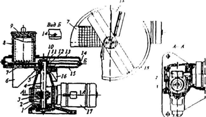 1 — червячный редуктор; 2 — червяк; 3 червячное колесо; 4 - вал; 5 — подшипник; 6— разгрузочный лоток; 7— ножевая решетка; 8- загрузочный цилиндр; 9 — груз-толкатель; 10—фасонная гайка; 11,12- втулки; I3- крышка; 14-штифт; 15 — тарелка; 16 — лоток для удаления крошки; 17 - электродвигатель; 18 - вращающиеся ножи.