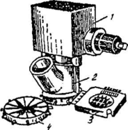 I - выходной нал; 2 — разгрузочный канал; 3— ножевой блок; 4— ось;