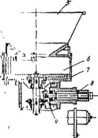 При нарезке овощей ручные приспособления (рисунок 6, а) служат для загрузки продуктов и подачи их при помощи толкателей к рабочим органам. Приспособление состоит из литого корпуса 8 , серповидного толкателя 5 и двух пазов для присоединения к приводному валу. Режущими инструментами механизма служат прямолинейные и терочные ножи. Для изменения толщины обрезаемых ломтиков предназначена специальная шайба, устанавливаемая между опорным диском и ножом.