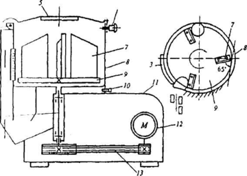 Машина МРОВ-160 (рисунок 9) состоит из станины, тарельчатого корпуса с загрузочным бункером, рабочих органов и приводного механизма. Рабочей камерой служит тарельчатый корпус, закрытый сверху крышкой. К крышке прикреплен загрузочный бункер, снабженный толкателем.