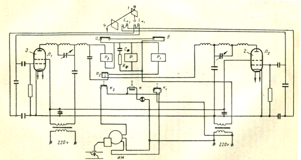 Регулятор состоит из измерительной части 1, двух электронных управляющих устройств 2 и 3, выполняемых на лампах Л1 и Л2, трех электромагнитных реле Р, Р1 и Р2 с контактами и исполнительного механизма ИМ.