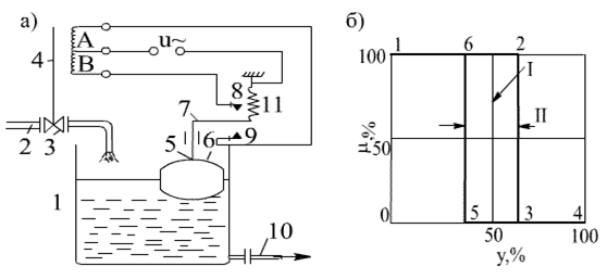 Чувствительный элемент регулятора – поплавок 6 измеряет уровень в баке; текущее значение уровня определяется положением штока 5 и жестко с ним соединенного рычага – контакта 7, который через пружину 11 соединен с источником питания напряжением U. Заданные значения верхнего и нижнего уровней определяются положением передвижных упоров – контактов 8 и 9, устанавливаемых вручную.