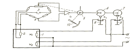 В качестве чувствительного элемента применяется электрический термометр сопротивления 2 который подключен к электронному автоматическому мосту 3 по трехпроводной схеме. Если температура в сушильной камере изменится, изменится сопротивление термометра и в диагонали a—b моста появится сигнал небаланса. Усиленный электронным усилителем 4 сигнал приводит во вращение ротор реверсивного двигателя 5; направление вращения зависит от знака небаланса, т. е. от того, повысилась или понизилась температура. С ротором реверсивного двигателя кинематически связаны диски б и 7, положение которых зависит от угла поворота ротора, а следовательно, от положения движка а реохорда и показывающей стрелки 10 моста. К профилю дисков с помощью пружин 8 и 9 прижаты ролики направляющих контактов k1 и k2.