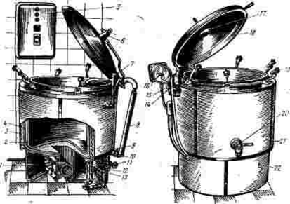 1 –крышка; 2 – варочный сосуд; 3 – теплоизоляция; 4 –пароводяная рубашка; 5 –станция управления; 6 – клапан-турбинка ; 7 – патрубок; 8 – противовес 9 –кран уровня; 10 – пароотводная трубка; 11 – вентиль (отвода пара); 12,13 – рукоятки вентилей подачи воды; 14 –наполнительная воронка; 15 –двойной предохранительный клапан; 16 – электроконтактный манометр; 17 – отражатель; 18 – двухстенная крышка; 19 – прижимные болты; 20 – сливной кран; 21 – наружный корпус; 22 – постамент.