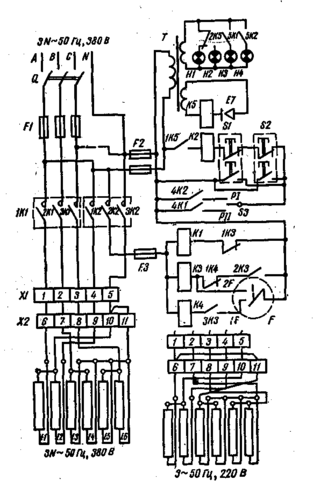 Включение аппаратов осуществляется пакетным выключателем Q, а переключение режима работы – переключателем S3. При этом напряжение из сети подается на силовые контакты магнитных пускателей К1, К2, трансформатор Т и цепь управления катушкой магнитного пускателя К2.