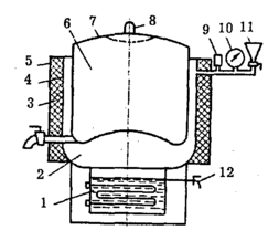 1 – парогенератор; 2 – паровая рубашка; 3 – тепловая изоляция; 4 – корпус; 5 – кожух; 6 – варочный сосуд; 7 – крышка; 8 – клапан-турбинка; 9 – двойной предохранительный клапан; 10 – манометр; 11 – наполнительная воронка; 12 – клапан уровня