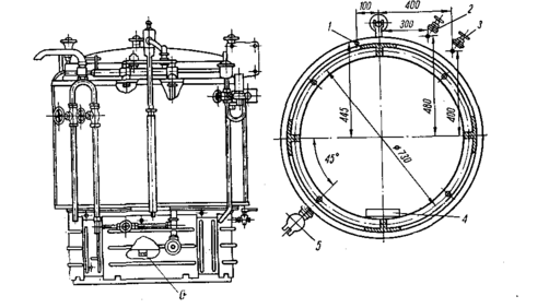 1 – отвод вторичного пара; 2 – подвод горячей воды; 3 – подвод холодной воды; 4 – подвод электроэнергии; 5 – отвод промывочной воды; 6 – пробка пароводяной полости.