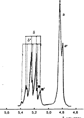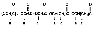 Для интерпретации спектров полимеризующейся системы использовали литературные и экспериментальные значения химических сдвигов сигналов мономеров. В ЯМР-спектре сополимера гликолида с L-лакти-дом присутствуют сигналы, имеющие химические сдвиги гомополимеров гликолида и L-лактида, а также два новых сигнала (синглет 4,81 млн доли и квартет 5,27 млн доли), которые следует отнести к сигналам протонов (см. рис.1), соответствующих перекрестному акту роста ц$пи (а, в). Можно предположить, что химические сдвиги метильных протонов лактида в перекрестном акте и в последовательности лактидных звеньев отличаются, по-видимому, очень мало (т.е. с'=с):