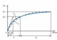 Анализ кривых переходного процесса, построенных на основании приведенной передаточной функции и экспериментальных данных, показывает, что процесс изменения температуры в помещении имеет два явно выраженных участка (рисунок 5). На первом (А) – процесс изменения температуры происходит быстро, скорость изменения температуры при этом зависит от кратности воздухообмена Кв. По литературным данным этот отрезок времени составляет (3–4)Кв-1. По мере поглощения теплоты ограждением и оборудованием скорость изменения температуры воздуха замедляется (участок В), проявляется инерционность ограждений (Тогр может составлять порядка десятка часов). Поэтому, теоретический конец переходного процесса достигается через несколько суток.