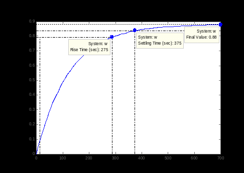 Линеаризировав систему и построив реакцию системы на единичный скачок, определим показатели качества системы управления. График полученной переходной характеристики и показатели качества изображены на рисунке 9.