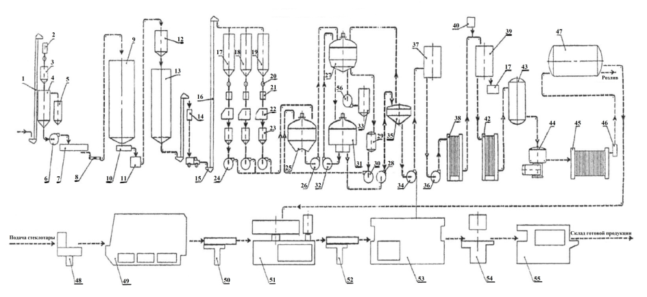 Рисунок 1 - Технологическая схема производства пива на ОАО "Владпиво" (обозначения см. в тексте работы).