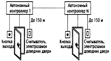 1. СКУД «ПроходА» (рис 1) и СКУД «ПроходМА» (рис. 2). Обе системы являются автономными. Первая предназначена для контроля доступа на одну точку прохода (в данном случае дверь), вторая на несколько точек прохода и состоит из отдельных автономных систем. В каждой автономной системе управление доступом осуществляется автономно работающим контроллером и служит для контроля входов людей в помещение (офис, комнату, кабинет, склад, зону и т.д.).