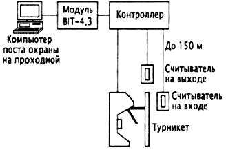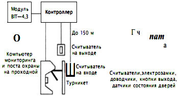 Элементы оборудования пункта прохода через проходную включают: считыватели на вход и на выход (считывают код карточкиключа пользователя и обеспечивают его ввод в контроллер при проходе через турникет), турникет, пульт (кнопка) управления турникетом.