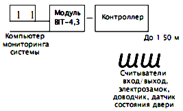 Элементы оборудования пункта прохода через дверь: считыватели на вход и на выход, датчик состояния двери, электрозамок, доводчик двери.