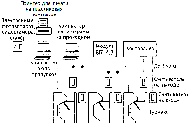 Интерфейс подключаемых считывателей: Т для считывателей идентификаторов типа «тачмемори», W для считывателей с интерфейсом Виганда. Компьютер бюро пропусков работает под управлением компьютера мониторинга, хранит базу данных пользователей, вносит в нее изменения, управляет вводом фотоизображений в базу данных, управляет печатью карточек-пропусков, автоматически формирует журналы событий и учета рабочего времени, формирует временные режимы доступа на объект для каждого пользователя. Электронный фотоаппарат обеспечивает ввод фотографии в компьютер, принтер предназначен для печати пластиковых карт, служебный считыватель считывает коды ключейкарточек пользователей при внесении их в базу данных и заполнении личных карточек.