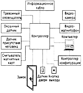 В ее состав входят: контроллер управления доступом, контроллер конфигурации системы, считыватель магнитных карт, мастеркарта, электромеханический замок, датчик двери и датчики объема. Дополнительно в состав системы может входить информационное табло «Занято/Свободно» и устройство видеозаписи (видеомагнитофон с подключенной к нему видеокамерой). Контроллер управления доступом обеспечивает доступ клиента в зону самообслуживания банкомата, слежение за датчиками охраны и присутствия человека около банкомата, управление замком, информационным табло, сигнализатором тревоги и устройством включения видеомагнитофона. Один контроллер конфигурации (и одно программное обеспечение) может обслуживать любое число банкоматов. Вместо контроллера конфигурации может использоваться переносной компьютер.