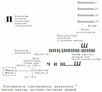5. СКУД «ОфисИ» система контроля и управления доступом с организацией контроля прохода и контроля датчиков сигнализации и видеоконтроля, дистанционного управления видео и телекамерами. Система позволяет получать изображение от камер на экране компьютера, а также вести запись изображения как по команде пользователя, так и в автоматическом режиме по факту срабатывания какоголибо из контролируемых датчиков. Система также обеспечивает учет рабочего времени сотрудников, получение разнообразных отчетов о событиях в системе. Вся информация в реальном режиме отображается на экранах компьютеров системы, в том числе на планах этажей зданий или планах территории. Рассматриваемая система выполнена на базе программного комплекса TSS2000Profi. Структурная схема СКУД «ОфисИ» приведена на рис. 13.