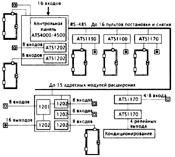 Ядром подсистемы СКУД служит контрольная панель ATS4000 (рис. 21). Максимальное число охранных зон в системе контроля доступа составляет 256. На плате контрольной панели есть 16 зон для подключения охранных датчиков и дополнительный разъем для подключения двух 8зонных расширителей. Базовым расширением охранных зон в системе контроля доступа является шина RS485, на которую подключаются адресные модули расширения. Максимальное расстояние между самыми удаленными модулями в системе контроля доступа составляет 1,5 км и может быть дополнительно расширено до 6 км с помощью изоляторов/повторителей. Линейка адресных модулей расширения включает модули на 4, 8 или от 8 до 32 охранных зон. В корпус адресного модуля ATS1201 системы контроля доступа устанавливаются до 3 зонных расширителей ATS1202, что дает расширение до 32 охранных зон. Дополнительно к адресному модулю системы контроля доступа расширения подключаются модули выходов на 16 выходов типа «Открытый коллектор», 4 или 8 реле. Таким образом, адресный модуль расширения представляет собой базовый элемент для построения охранной системы контроля доступа.