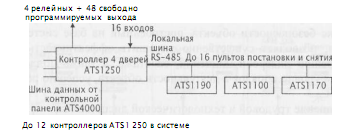 Контроллер хранит в памяти все базы данных и может работать автономно при аварийном отключении от контрольной панели системы контроля доступа. На системную шину данных RS485 контрольной панели ATS4000 можно подключить до 12 таких контроллеров (48 интеллектуальных дверей).