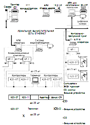 Каждое автоматизированное рабочее место (АРМ) специализировано на выполнение определенных функций за счет установки соответствующего ПО и настройки связей между составными частями системы. Число АРМ любого вида в системе не ограничено. Основой периферийной аппаратуры системы являются контроллеры, к которым подключаются считыватели пропусков, СО, кнопки экстренного вызова, отметки наряда, ЭМЗУ, турникеты, внешние устройства, управляемые релейными выходами контроллеров и т. д. Подключение контроллеров к станционной части системы осуществляется с помощью коммуникационных комплектов КР1, каждый из которых обеспечивает обмен информацией по четырем независимым магистралям длиной до 5 км каждая. Магистраль представляет собой одну витую пару кабеля ТПП или кабеля с аналогичными характеристиками. К каждой магистрали подключается до 25 контроллеров. Программное обеспечение АРМ оператора поддерживает работу до четырех комплектов КР1, т. е. до 400 контроллеров.