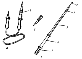 Рис. 16. Покажчики напруги: а, б — в установках до 1000 В; в — в установках понад 1000 В; 1 — неонова лампочка;. 2 — щуп; 3, 4 — робоча й ізолююча частина покажчика; 5 — ручка