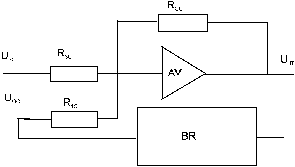 При розгляданні тиристорного перетворювача, слід враховувати його інерційність. В системі, утворений внутрішній контур (рис 2 а,б) регулювання струму з датчиком струму US (зворотній зв’язок по струму) і регулятором струму AS. Зовнішній контур регулювання швидкості (рис 3 а,б) має датчик швидкості тахогенератор BR і регулятор швидкості AV. На вхід регулятора швидкості AV подається сигнал задання Ux і сигнал UЗЗ зворотнього зв’язку, що пропорційний по величині швидкості двигуна. Регулятор швидкості виробляє сигнал UЗТ для регулятора струму, на другий вхід якого подається сигнал UОТ , пропорційний величині струму двигуна.