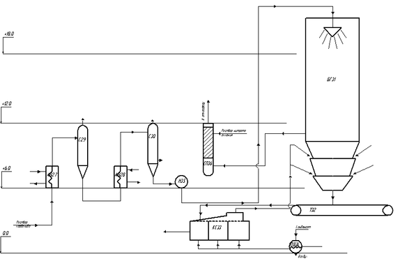 Полученный раствор карбамида последовательно упаривают в выпарных аппаратах первой и второй ступени 27 и 28 соответственно при температуре 120–125°С и давлении 30–40 кПа и 130–140°С и давлении около 3–5 кПа. Полученный плав карбамида концентрацией 99,7–99,8 масс. % поступает в грануляционную башню 31 и распыляется в ней. Образующиеся мелкие частицы при падении вниз охлаждаются в полом объеме башни потоком воздуха, идущим снизу вверх, и превращаются в гранулы. В нижнюю часть башни засасывается атмосферный воздух, и подается воздух из аппарата для охлаждения гранул «КС» 33. Образовавшиеся гранулы нитрата аммония из нижней части башни поступают на транспортер 32 и в аппарат кипящего слоя 33 для охлаждения гранул, в который через подогреватель 34 подается сухой воздух. Из аппарата 33 готовый продукт направляется на упаковку.