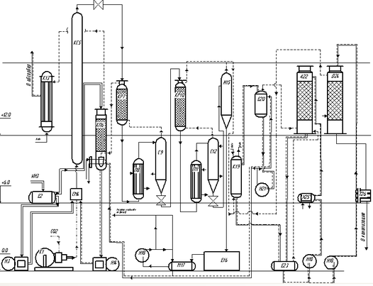 Образовавшийся в колонне синтеза плав, содержащий 30-31% карбамида, 21-22% карбамата аммония, 33-34% избыточного аммиака, 14-16% воды направляются на двухступенчатую дистилляцию. Агрегат дистилляции каждой ступени состоит из трех аппаратов: ректификационной колонны, подогревателя и сепаратора.
