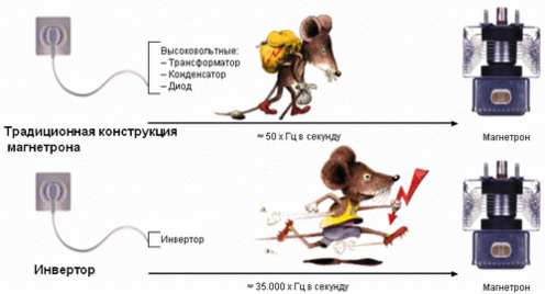 | 1. Эффективность (КПД) 60%. | Эффективность (КПД) 70% На 100 Вт выше энергия микроволн при неизменном энергопотреблении. | Экономия времени до 10% и электричества до 15%. Экономия времени до 30% при размораживании. |