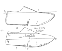Один из плоских шаблонов слепков, откорректированных с наружной и внутренней сторон, обводят остро заточенным карандашом или шилом. Со слепка на лист переносят точки Б, Вп П и нахлест в теленке, а также проводят прямую БВп. Второй шаблон совмещают с очерченным так, чтобы точки Б совпали, а точка Вп оказалась на линии БВп. Шаблон обводят штриховой линией. Разницу между двумя контурами усредняют, кроме пучково-носочной и геленочной частей, чтобы предотвратить перекосы заготовок при формовании (рисунок 5). Длину УРК замеряют по геодезической линии между точками Н и Нв.