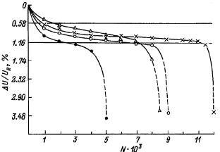 Скорость звука измеряли до и после приложения нагрузок. Часть образцов испытали до разрушения методом малоцикловой усталости. Скорость поверхностных волн измеряли периодически, по мере возрастания числа наработанных циклов N. Согласно (рис. 5) с ростом числа циклов, уровня циклических напряжений и температуры испытаний скорость волн в образце уменьшается.