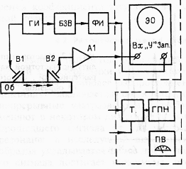 Рис. 10. Блок-схема импульсного прибора (а): ГИ – генератор импульсов; В1 и В2 – излучающий и приемный пьезопреобразователи; Об – образец (изделие); Ус (А1) – усилитель; БЭВ – блок задержки времени; ФИ – формирователь импульсов; Т – Трйггер; ГПН – генератор пилообразного напряжения; ПВ – пиковый (амплитудный) вольтметр, ЭО – электронно-лучевой осциллограф