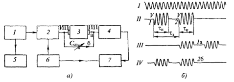 (рис. 12 6). длительность ч амплитуда У время задержки т и период повторения импульсов задаются модулятором б (рис. 12 а). с помощью пьезоэлектрических излучателя ИП и приемника ПП импульсы проходят как акустические колебания. Приемный тракт прибора 4 состоит из аттенюатора и усилителя. сигналы наблюдают на осциллографе 7.