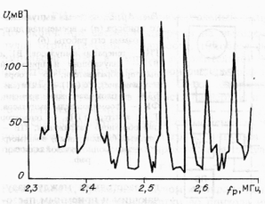 Для исключения влияния акустического контакта на результаты измерений образец вместе с преобразователями помещается в иммерсионную ванну, заполненную водой. Температура воды и соответственно образца измеряется термометром с точностью 0,1 К. Для акустических исследований резонансным методом наиболее удобны образцы в форме цилиндра диаметром 20–21 и длиной 80–90 мм с шероховатостью поверхности Rmax = 3,2 – 12,5 мкм. Их геометрические размеры можно контролировать с ошибкой 5 мкм микрометром и измерительным микроскопом. Для установления корреляций между резонансными ликами исследуемого образца после различных термообработок амплитудно-частотные зависимости необходимо снимать в диапазоне частот от 2,2 до 2,9 МГц, охватывающем не менее десяти резонансных ликов. Положение экстремальных точек этой зависимости определяется с ошибкой 0,1 кГц. На рис. 9. приведен участок амплитудно-частотной характеристики одного из образцов.