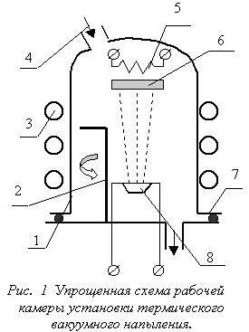 Основными элементами установки вакуумного напыления, упрощенная схема которой представлена на рис.1, являются: 1 - вакуумный колпак из нержавеющей стали; 2 - заслонка; 3 - трубопровод для водяного нагрева или охлаждения колпака; 4 - игольчатый натекатель для подачи атмосферного воздуха в камеру; 5 - нагреватель подложки; 6 - подложкодержатель с подложкой, на которой может быть размещен трафарет; 7 - герметизирующая прокладка из вакуумной резины; 8 - испаритель с размещённым в нём веществом и нагревателем (резистивным или электронно-лучевым).