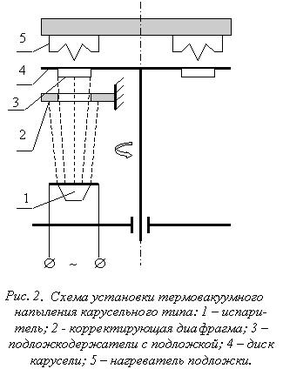 С учётом изложенного производственные установки термовакуумного напыления снабжены вращающимися устройствами (дисками, барабана-ми), несущими несколько подложек (6, 8 или 12). Подложки последовательно и многократно проходят над неподвижным испарителем (рис.2), постепенно набирая необходимую толщину плёнки. В результате центральный "холм", который мог бы образоваться, на неподвижной подложке, размывается в хребет, вытянутый в направлении движения подложки. Для выравнивания толщины плёнки в поперечном направлении применяют корректирующую диафрагму, устанавливаемую между испарителем и подложкой в непосредственной близости от нее. Профиль диафрагмы рассчитывается на основании исследования рельефов плёнки, получаемых при напылении на неподвижную и движущуюся подложки. В результате различия времени облучения центральной и периферийной зон подложки равномерность толщины плёнки на всей площади групповой подложки повышается и находится в пределах ±2% (для подложек 60х48 мм).