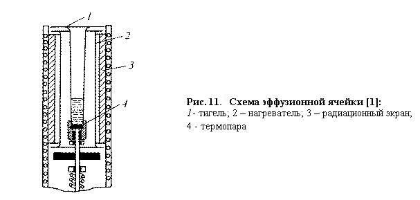 Испарение материалов, осаждаемых в сверхвысоком вакууме на подложку, закрепленную на манипуляторе с нагревательным устройством, осуществляется с помощью эффузионных ячеек (эффузия – медленное истечение газов через малые отверстия). Схема эффузионной ячейки приведена на рис.11. Эффузионная ячейка представляет цилиндрический стакан, выполненный из пиролитического нитрида бора или высокочистого графита. Поверх тигля располагаются, нагревательная спираль из танталовой проволоки и тепловой экран, изготовленный обычно из танталовой фольги.