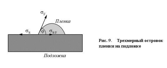 Из условия равновесия для любого элемента длины линии соприкосновения подложки, трехмерного островка пленки и вакуума (рис. 9.) получим