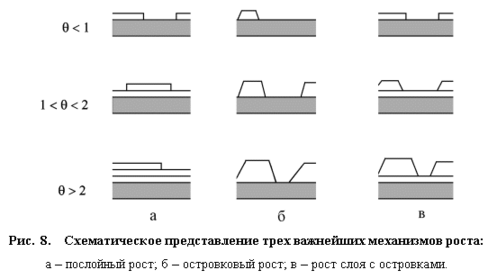3. Промежуточным между этими двумя механизмами является рост Странски-Крастанова (Stransky-Krastanov, SK, layer-plus-islandgrows), при котором первый слой полностью покрывает поверхность подложки, а на нем происходит рост трехмерных островков пленки. К этому механизму могут приводить многие факторы, в частности достаточно большое несоответствие между параметрами кристаллических решеток пленки и подложки (см. рис.8,в).