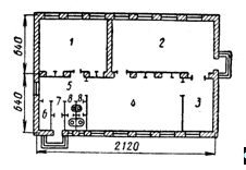 1 кабинет обслуживающего труда; 2 — столярное отделение; 3 –инструментальная 4 — слесарно-механическое отделение; 5— вестибюль; 6 — раздевалка; 7— тамбур; 8—туалет.