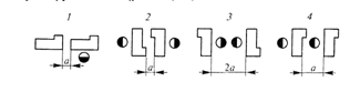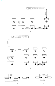 1— по фронту; 2 — между тыловыми сторонами; 3 — фронтом друг к другу; 4 — в затылок. Расстояние а) для малогабаритного оборудования — 500 мм, для среднегабаритного — 600 мм, для крупногабаритного - 800 мм