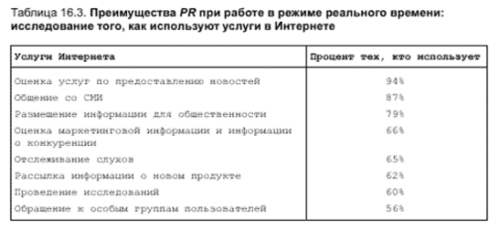 Фразер Сейтел говорит: “Нет сферы деятельности в области PR, более активно развивающейся в новом тысячелетии, чем Web-сайты, операции в Интернете и общее использование Интернета для коммуникаций с целевыми аудиториями”.21 В табл. 16.3 приводятся данные о том, как специалисты по PR используют услуги в режиме реального времени, основанные на исследовании, проведенном агентством Creamer Dickson Basford.22