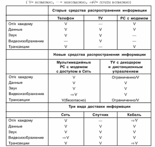 Среди новых средств ясно, что лучшие — это PC и TV, с их периферийными устройствами. Сопоставление трех средств транспортировки показывает, почему сетевой сервис, такой как CompuServeв и America OnLineв, являются конкурентами вещательным компаниям. Функции и потенциал этих двух средств распространения информации становятся все более сходными.