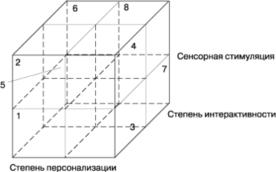 Изображенный на рис. 3 маркетинговый Медиа-куб; демонстрирует три измерения, которые определяют потенциал средств распространения информации в рамках маркетинговой функции: степень персонализации, степень интерактивности и сенсорную стимуляцию. Эти важные характеристики, зависящие от функции средств распространения информации в рекламном процессе, можно увидеть на маркетинговом Медиа-кубе ; ; Мы имеем дело с комбинацией трех измерений.