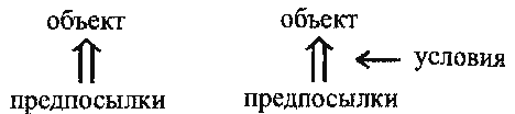 Понятие развития предполагает преемственность, зависимость последующего от предыдущего. Если, к примеру, появление какого-то явления определили два других явления, то в зависимости от того, как они его определяли, мы различаем два возможных случаях и проводим разграничение между предпосылками и условиями. Когда мы рассматриваем предшествующие явления как предпосылки, то они как бы переходят в последующие явления и вместе с тем исчезают. Когда же мы говорим об условиях, то они всегда остаются. В связи между предпосылками и развившимся явлением нет взаимодействия, а в связи между условиями и развившимися явлениями взаимодействие обязательно должно быть. Схематически эти два случая могут быть представлены так: