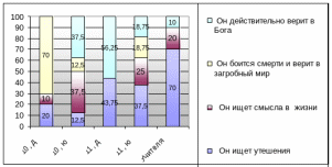 Легко заметить, что девушки в большей степени склонны идти в учреждения культа за религиозными наставлениями или для того, чтобы выполнить религиозные предписания. Юношей же привлекает особая атмосфера, так же они посещают их, просто отдавая дань традиции. Такой мотив как «любопытство» так же встречается только у юношей. В целом количество респондентов, выбравших чисто религиозные мотивы, невелико.