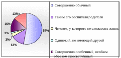 Следует отметить, что этот вопрос перекликается с ранее задаваемым «Почему человек приходит к религиозному существованию?». Это даёт возможность уточнить позицию респондентов, проверить прочность их позиций и искренность высказываемых ими мнений. Как и в первом случае, ответы на вопрос «По вашему мнению, верующий человек-это…», предполагающие предвзятое, негативное отношение к верующим, («Человек с нарушенной психикой», «Человек, нашедший в религии выгоду, прежде всего материальную»), не выбирались. Чаще всего в опросных листах встречался ответ «Совершенно обычный» – от 45% у девушек 10 класса до 70% у учителей. Респонденты отмечают также роль семьи в формировании религиозных убеждений – от 5 до 18,75% в разных группах.