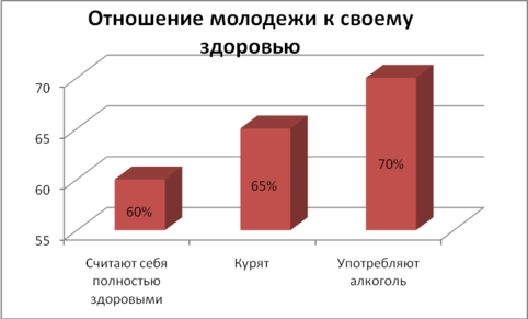 Проанализировав полученные данные, мы пришли к выводу, что 60% опрошенных нами юношей и девушек считают себя полностью здоровыми. Однако, 65% зная о вреде курения, продолжают курить, а 70% употребляют алкоголь, зная о том, что это вредно для здоровья (Рис.1).